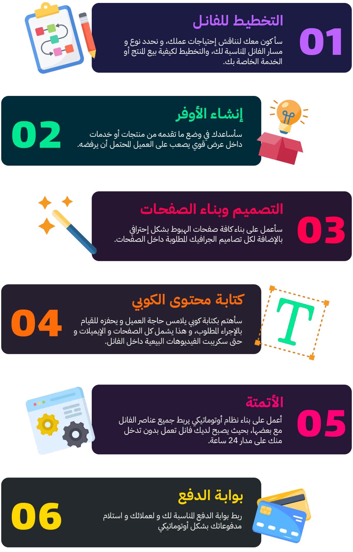 أنا وفريقي هننفذ لك كل شيء بالكامل بإيدينا: من تصميم الفانل، وكتابة الكوبي، لحد إعداد الأتمتة وربط كل حاجة ببعض.